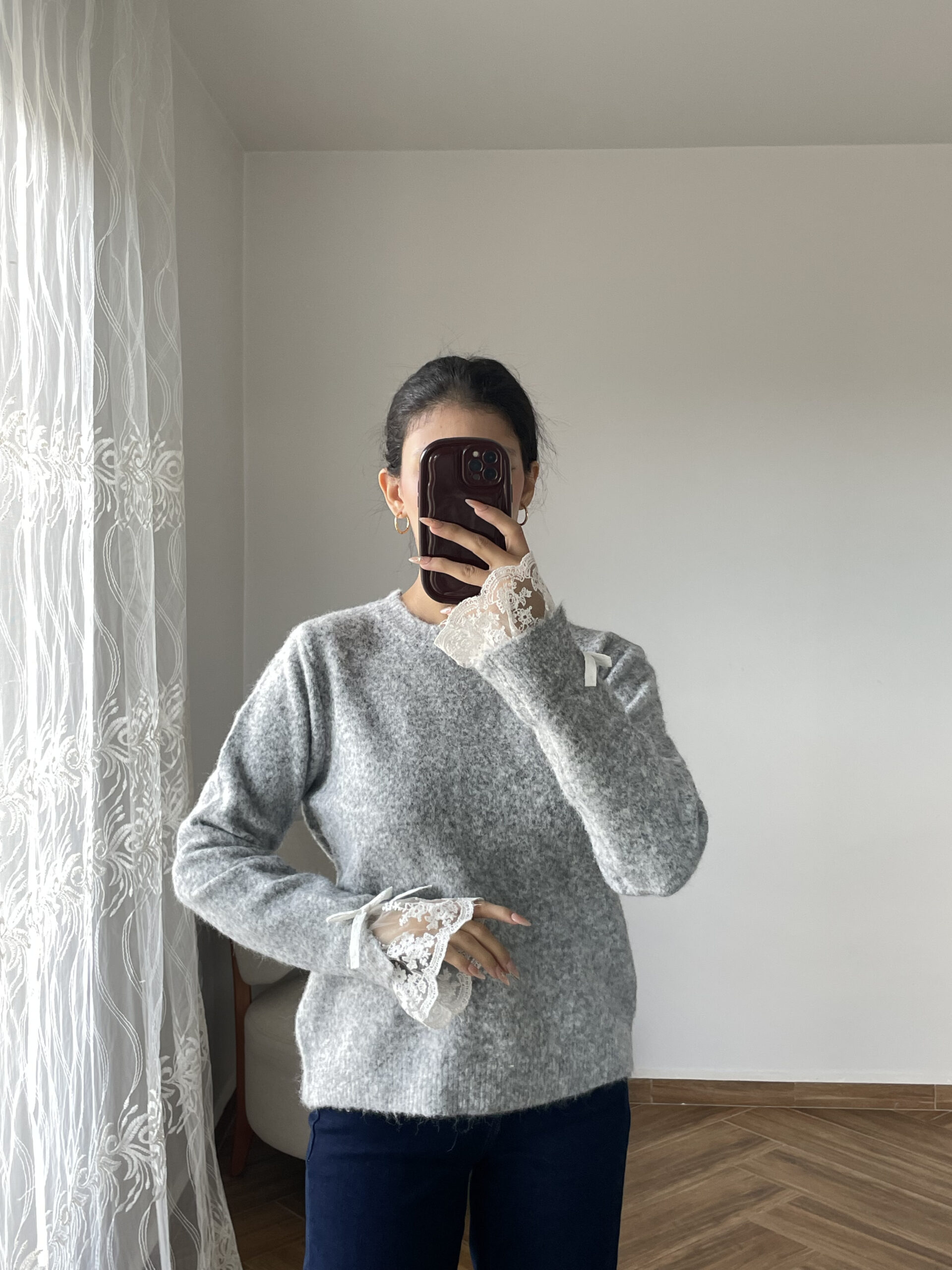 Pull femme en maille douce effet mohair, inspiré de la tendance européenne. Confortable et raffiné, il se distingue par ses finitions en dentelle aux poignets et ses rubans délicats. Une pièce chic et féminine pour une élégance moderne au quotidien.